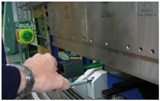 Häufig versuchen Bedienpersonen zur Beseitigung von Störungen verklemmte Werkstücke, Abfallmaterial oder Schmutzpartikel mit den Händen aus dem Werkzeug zu entfernen, ohne die Presse durch Betätigen der Schaltsperre (Ausschalteinrichtung) zu sichern. Hierzu werden oft auch Teile der festen Verkleidungen entfernt und für die weiteren Arbeiten nicht wieder angebracht.