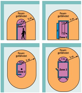 Die Größe bzw. Ausdehnung des explosionsgefährdeten Bereiches der Zone 1 hängt jedoch davon ab, wie und welche Menge abgefüllt wird und welche örtlichen Lüftungsverhältnisse am Abfüllplatz (Objektabsaugung, Raumabsaugung) vorliegen. Daher lässt sich die Ausdehnung des explosionsgefährdeten Bereiches, der in Zone 1 eingestuft wird, nur im Einzelfall festlegen. Dies kann in Anlehnung an die Beispielsammlung der BG-Regel "Explosionsschutz-Regeln (EX-RL)" (BGR 104) Punkt