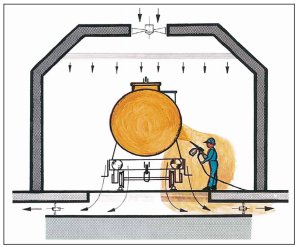 Der Spritzstand ist der Lackierarbeitsplatz, an dem die geringste Belastung des Lackierers durch Lacknebel zu erwarten ist, gefolgt von der Spritzkabine, die allerdings den besten Schutz für andere Personen außerhalb der Kabine bietet.