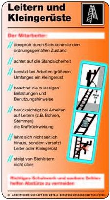 Hinweise zum sicheren Benutzen von Leitern und Tritten zeigt Bild 2-9 (Merkkarte aus dem Mitteilungsblatt "sicher arbeiten").