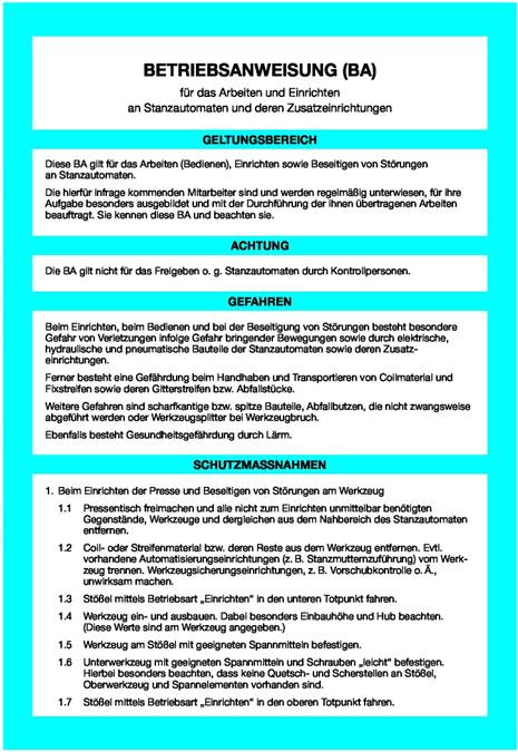 Bild 4-3: Beispiel für eine Betriebsanweisung "Einrichten (Rüsten) einer Exzenterpresse"