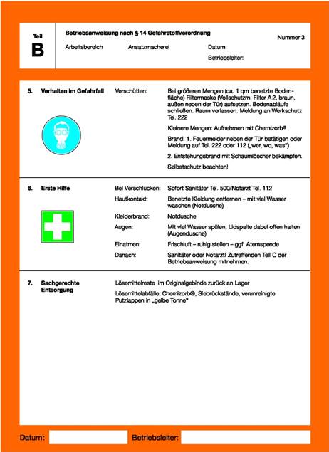 Bild 4-16: Beispiel für eine arbeitsplatz- und tätigkeitsbezogene Betriebsanweisung; bestehend aus einem allgemeinen Informationsteil (A), z.B. als Aushang an den Zugängen, der eigentlichen Betriebsanweisung (B), z.B. als Aushang am Arbeitsplatz, und Zusatzinformationen über einzelne Gefahrstoffe (C), z.B. ausgelegt an einem allgemein zugänglichen Aufbewahrungsort (Anhang 1 zur TRGS 555)