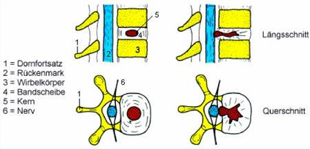 Wenn der Kern völlig durch den Faserring hindurchtritt, spricht man von einem "Bandscheibenvorfall" (Bild 2-2). Der "vorgefallene" Kern drückt auf die in seinem Bereich abgehenden Nervenwurzeln und verursacht meist sehr schmerzhafte Störungen und teilweise oder gänzliche Lähmungen der von diesen Nerven versorgten Muskelpartien.