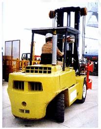 Ein Vierradstapler: Man erkennt, dass sich der Fahrzeugkörper ähnlich wie beim Dreiradstapler hinten praktisch nur auf einem Punkt abstützt.