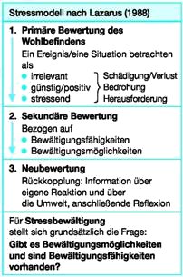 In Abhängigkeit von ganz individuellen Eigenschaften des Menschen (z.B. Alter, Geschlecht, Gesundheitszustand, Erfahrung, Anlagen) wirken sich Stressoren in Form von körperlichen, geistigen und emotionalen Beanspruchungen unterschiedlich aus. Wann eine Person in Stress gerät oder davon ermüdet, hängt von deren persönlichen Leistungsfähigkeit und den Erholungsmöglichkeiten ab. Was eine Person am Arbeitsplatz hohen Belastungen entgegensetzen kann, ist, wie in dem von Lazarus beschriebenen Stressmodell, von den zur Verfügung stehenden persönlichen und betrieblichen Ressourcen abhängig. Nach Lazarus spielen demnach Bewertungsprozesse eine entscheidende Rolle. Dabei stehen Bewältigungsmöglichkeiten und Bewältigungsfähigkeiten im Vordergrund.