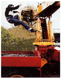 Eine spezielle Gefahr besteht bei Ladekranen dann, wenn der in Transportstellung gebrachte Kran während der Fahrt über das zulässige Lichtraumprofil des Fahrzeuges hinausragt oder dieses unkontrolliert verlässt. Ein abruptes Hängenbleiben an Tordurchfahrten, Brücken u.ä. ist häufig die Folge (Abb. 99). Die Gefährdung ist insbesondere bei solchen Ladekranen gegeben, deren Ausleger