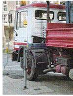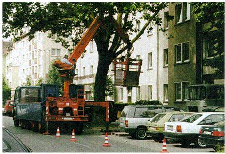 Bei der Auswahl eines geeigneten Ladekranes ist darüber hinaus auch zu bedenken, ob der Kran im praktischen Betrieb vom Kranführer so betrieben werden kann, wie es die Betriebsanleitung des Kranherstellers vorschreibt. Diese fordert im allgemeinen, dass Ladekrane nur mit vollständig ausgefahrenen Abstützträgern (gemeint sind alle Stützen) betrieben werden dürfen. Dies läßt sich z.B. bei Ladekranen, die im Bereich des öffentlichen Verkehrs sog. "Wertstoffbehälter" entleeren, vom Kranführer nicht immer einhalten. Ein typisches Beispiel sind parkende Fahrzeuge, die das Benützen der Kranabstützung behindern. Der Kranführer wird gezwungen, entgegen den verbindlichen Angaben in der Betriebsanleitung zu arbeiten. Er verstößt dabei auch gegen Unfallverhütungsvorschriften (Abb. 135). Unfälle können die Folge sein. Für derartige Arbeiten könnte ein geeigneter Ladekran so aussehen, dass er entweder 2 Arbeitsbereiche mit unterschiedlichen Tragfähigkeitstabellen für