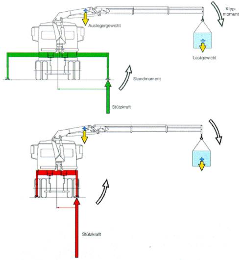 hat. Anderenfalls muss die Standsicherheit des Fahrzeuges so groß sein, dass auf waagerecht ausfahrbare Abstützträger verzichtet werden kann. Damit ist für den Kranführer die Versuchung zur nicht bestimmungsgemäßen Benutzung der Stützen nicht mehr gegeben.