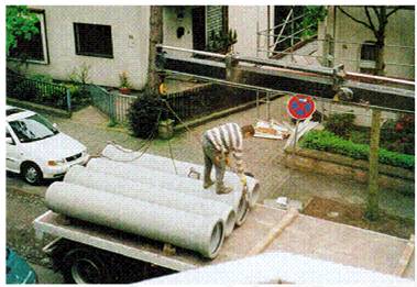 Fehlt die Umwehrung, darf der Steingreifer nur im bodennahen Bereich eingesetzt und das Steinpaket nicht über Personen hinweggeführt werden (Abb. 190). In diesem Fall darf der Kranführer das Steinpaket nur vom Lkw abladen und auf dem Lagerplatz neben dem Fahrzeug absetzen. Ein Absetzen an der Verwendungsstelle, z.B. im Keller oder auf Geschoßdecken des Bauwerks, ist nicht zulässig (Abb. 191).