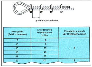 Tabelle 6: Anzahl der Drahtseilklemmen und Anziehmoment nach DIN 1142 (Auszug)