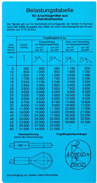 Die in den Belastungstabellen angegebenen Werte lassen sich auch mit Hilfe von Lastanschlagfaktoren berechnen (vgl. Anhang). Der Lastanschlagfaktor LA ist ein Rechenwert, in dem die beim Anschlagen auftretenden Belastungen zusammengefasst werden. Die erforderliche Tragfähigkeit des Anschlagmittels pro Strang wird berechnet, indem das Lastgewicht durch den Lastanschlagfaktor geteilt wird.