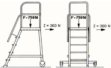 Für den Nachweis der Standsicherheit durch Berechnung wird, soweit für den Benutzungsfall keine ungünstigeren Voraussetzungen vorzusehen sind, eine Einzellast von FV = 750 N in Podestmitte, für das Kippmoment an ungünstigster Stelle eine horizontale Kraft von FH = 300 N in Podesthöhe senkrecht zur ungünstigsten Kippkante angesetzt. Beim Nachweis der Standsicherheit durch Prüfung wird die horizontale Kraft entsprechend des Sicherheitsbeiwertes von 1,2 auf Z = 360 N erhöht (siehe Bild 3). |