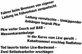 Trotzdem berichten nach wie vor die Medien täglich über schwere Unfälle, die auf ungenügende oder gar fehlende Ladungssicherungen zurückzuführen sind. Zur Erinnerung ein paar Schlagzeilen: