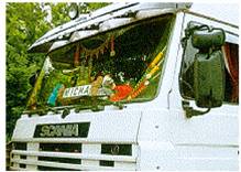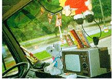 In letzter Zeit hat die Unsitte zugenommen, diese Sicht durch Innendekoration des Führerhauses derart einzuschränken, dass z.T. nur noch "Sehschlitze" übrig bleiben. Allein gegen den Vornamen "Micha" dürfte nichts einzuwenden sein (Abb. 3). Jedoch gegen das Schild selbst, welches das Sichtfeld des Fahrers erheblich verkleinert, muss Einwand erhoben werden. Weitere aufgehängte Wimpel- und Fähnchengirlanden, Aufkleber und Andenken, aufgestellte Kaffeemaschine und Fernseher (Abb. 4) engen die Sicht bei einigen Fahrzeugen derart ein, dass sie sofort aus dem Verkehr gezogen werden müssten und erst nach Beseitigung dieser Gefahrenquellen ihre Fahrt fortsetzen dürften. Es ist zu hoffen, dass dieser Unfug aufhört, denn er stellt einen klaren Verstoß gegen bestehende Vorschriften dar.