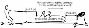 Es soll noch einmal das "Schlittenbeispiel" aus dem Abschnitt "Kraft und Masse" zur Anschauung herangezogen werden (ausführlicher Rechengang siehe Anhang 3). Die Kraft F von 250 N (25 daN ≈ 25 kg), die der Vater zum Abbremsen des Schlittens auf der angenommenen Strecke s = 2,5 m benötigt, hängt zum einen von der Masse des besetzten Schlittens, zum anderen von dessen Geschwindigkeit ab. Der Unterschied zwischen beiden Einflussgrößen liegt nun darin, dass die Masse m des Schlittens "einfach", die Geschwindigkeit v jedoch "quadratisch" eingeht. Konkret ausgedrückt: Eine Verdoppelung der Schlittenmasse m auf 100 kg bewirkt eine Verdoppelung der erforderlichen Kraft F auf 500 N (50 daN ≈ 50 kg), eine Verdoppelung der Geschwindigkeit v auf 36 km/h erfordert jedoch schon eine Vervierfachung der Kraft F auf 1000 N (100 daN ≈ 100 kg).