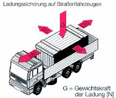 Die im Kapitel "Physikalische Grundlagen zur Ladungssicherung" an Beispielen erläuterten Zusammenhänge sind auf die Verhältnisse beim Transport von Gütern übertragbar. An einer Lkw-Ladung können aufgrund von Anfahr- und Bremsvorgängen sowie bei Kurvenfahrten Kräfte wirken, gegen die die Ladung zu sichern ist.