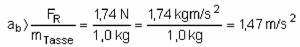 Das bedeutet, dass die Tasse ab einer Bremsverzögerung des Zuges von ab > 1,47 m/s2 in Bewegung gerät. Diese Verzögerung ist nicht sehr groß, denn der Zug würde mit diesem Wert bei der angenommenen Geschwindigkeit von 200 km/h eine Strecke von ca. 1 km bis zum Stillstand benötigen.