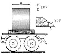 Da Güter in Rollenform (Bandstahlringe/Coils, Kabeltrommeln, Betonrohre mit großem Durchmesser und sonstige zylindrische Ladegüter) im allgemeinen so verladen werden, dass deren Rollrichtung quer zur Fahrtrichtung liegt, besteht die größte Gefahr des Verrollens bei Kurvenfahrt. Die VDI 2700 gibt unter dem Abschnitt "Güter in Rollenform" präzise Werte vor, wie derartige Güter zu sichern sind. Das gilt sowohl bei Verladung von Gütern mit Rollrichtung quer zur Fahrtrichtung (Abb. 111) als auch mit Rollrichtung in Fahrtrichtung (Abb. 112).
