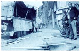 Beim Durchfahren einer Rechtskurve gerieten die in Sattellage stehenden schmalen Papierrollen samt einer auf der Ladefläche stehenden Lage ins Kippen (Abb. 121). Dank eines verstärkten Planenaufbaues konnte ein Herabfallen der Rollen verhindert werden. Bei der Beladung wäre zumindest eine Bündelung der schmalen Rollen zu einer Einheit je Lage erforderlich gewesen.