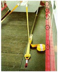 Bei Einhaltung dieser Norm gehört es hoffentlich bald der Vergangenheit an, dass für Haken von Zurrmitteln (un-) geeignete Befestigungspunkte unter Fahrzeugaufbauten gesucht werden (Abb. 127 - 129), wobei die Haken nicht selten derart auf Biegung beansprucht werden, dass es zum Bruch kommt. Diverse weitere Nachteile dieser improvisierten Verzurrmethoden ließen sich aufzählen.