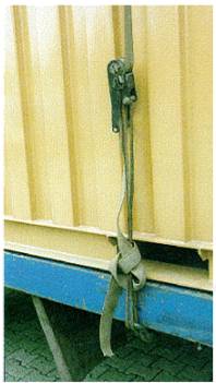 Achtung:Vorsicht beim Lösen der Verzurrung von kippgefährdeten Gütern, wenn Ratschen als Spannelemente von Zurrgurten benutzt werden! Genauere Hinweise siehe unter Kapitel "Vorsicht beim Be- und Entladen von Gütern mit schmaler Standbasis und/oder außermittigem Schwerpunkt"