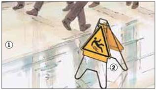 durch geeignete Oberflächenbeschaffenheit rutschsicher gestaltet werden (z.B. rutschhemmende Matten (1), Betonplatten),