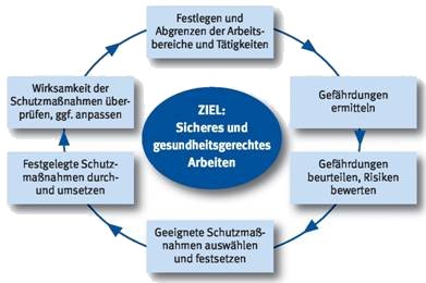 Bei einer Gefährdungsbeurteilung (siehe auch Bild 2) ermittelt und bewertet der Unternehmer die Gefährdungen für seine Beschäftigten, die sich im Rahmen ihrer Tätigkeit aufgrund des eingesetzten Arbeitsmittels, des gewählten Arbeitsverfahrens und der Arbeitsumgebung ergeben können. Sie hat das Ziel, Maßnahmen festzulegen, die eine Gefährdung für Leben und Gesundheit möglichst vermeiden und die verbleibenden Gefährdungen so gering wie möglich halten.