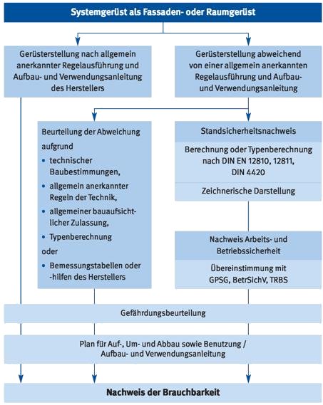 Für Gerüste und Gerüstbereiche, die nicht nach einer allgemein anerkannten Regelausführung errichtet werden, ist für die Brauchbarkeit ein Standsicherheitsnachweis auf Grundlage der Technischen Baubestimmungen der bauordnungsrechtlichen Vorschriften der Länder zu erbringen (siehe auch Bild 6).