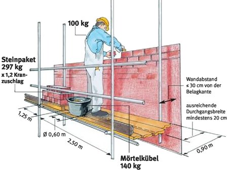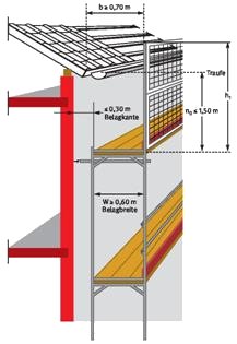 | Die Summe der Verkehrslasten aller übereinander liegenden Gerüstlagen in einem Gerüstfeld darf den vorgenannten Wert nicht überschreiten. | |||||||