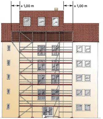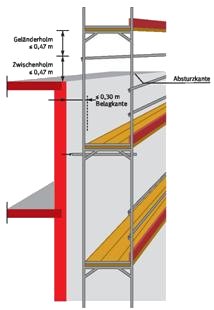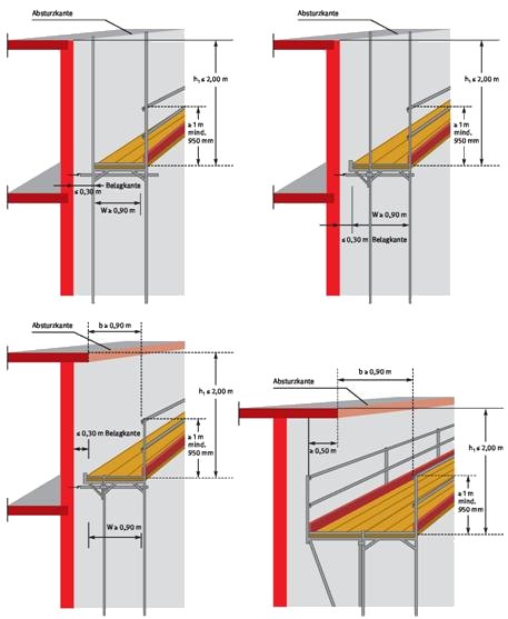Für den Auf-, Um- und Abbau können in Abhängigkeit von dem einzurüstenden Objekt, der Gerüstbauart, der Gerüstkonstruktion, des Gerüstsystems sowie Eigenart und Fortgang der auszuführenden Tätigkeiten unterschiedliche Maßnahmen zum Schutz gegen Absturz in Frage kommen.