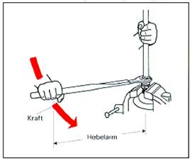 Unter Moment - gemessen in Newtonmetern (Nm) - versteht man eine aus Kraft x Hebelarm zusammengesetzte Größe (Abb. 14). Sie findet sich beim gleislosen Fahrzeugkran z.B. in den Begriffen " Standmoment" und " Kippmoment" (Abb. 15).
