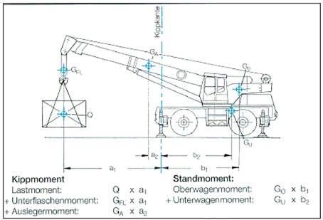 Das Kippmoment wird gebildet von den Gewichtskräften derjenigen Kranmassen, die das Bestreben haben, den Kran umzukippen, sowie von der zu hebenden Last.