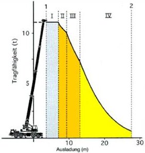 1. Kleinste Ausladung I max. Zugkraft der Winde (DIN 15020 Teil 1); II Festigkeit der Bauteile (DIN 15018), z.B: Drehbindung III Festigkeit der Bauteile (DIN 15018), z.B: Ausleger IV Standsicherheit (DIN 15019 Teil 2); 2. größte Ausladung