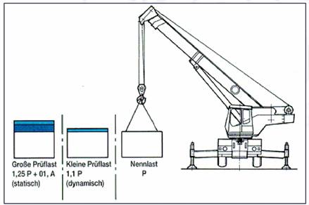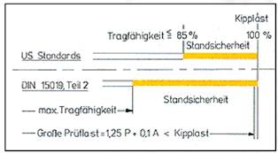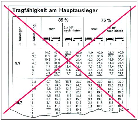 Die Angaben der höchstzulässigen Belastung in der Tragfähigkeitstabelle müssen die in der Bundesrepublik geltenden Regeln der Technik erfüllen. Die Werte müssen einer Nachprüfung auf der Grundlage der geltenden Normen standhalten. Angaben wie: Tragkräfte überschreiten nicht 85 % der Kipplast dürfen im und am Kran nicht vorhanden sein da sie die geltenden Normen und damit, die UVV "Krane" (BGV D6) nicht erfüllen (Abb. 40)