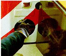 Durch den Einsatz von Verbrennungsmotoren ergeben sich spezifische Gefährdungen, da deren Abgase Gesundheitsgefährdungen und Belästigungen verursachen. Außerdem besteht die Möglichkeit der Verbrennung an heißen Oberflächen, wenn diese eine Temperatur von mehr als 60 °C annehmen können (Abb. 52). Darum müssen Mündungen von Auspuffleitungen so angeordnet sein, dass die austretenden Abgase nicht auf Personen gerichtet sind. Sie dürfen auch nicht dort enden, wo die Stellteile für die Kranabstützung am Unterwagen angeordnet sind.
