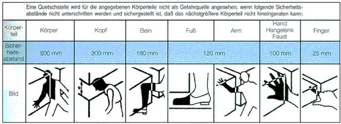 Abb. 33: Mindestabstände zur Vermeidung des Quetschens von Körperteilen (Auszug nach DIN EN 349)