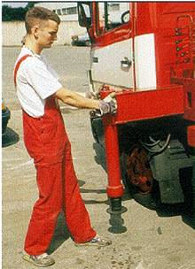 Gefahrquellen sind z.B. Stellen des Kranes, an denen von Hand bewegte Teile, wie Abstützträger (Abb. 34) und mechanische Teleskope, beim Ausziehen ungeführt herabfallen und Verletzungen bewirken können. Durch Anschläge oder gleichwertige konstruktive Maßnahmen muss das unkontrollierte Verlassen ihrer Führungen verhindert sein.
