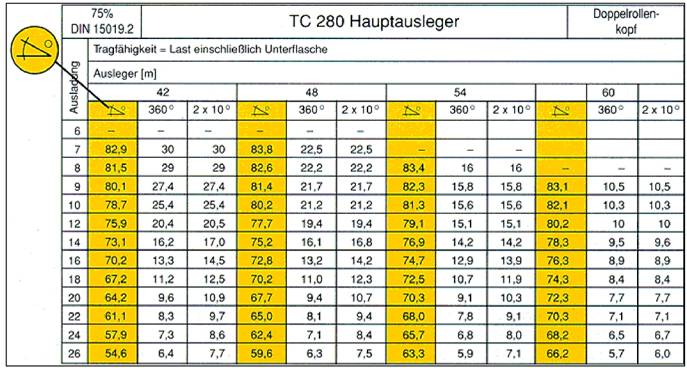 Abb. 39: Lasttabelle mit Angabe des Auslegerwinkels