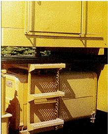 Einen Unfallschwerpunkt bilden Unfälle beim Besteigen und Verlassen des Kranes, seines Steuerstandes oder sonstiger Arbeitsplätze, die zum Auf- und Abrüsten eingenommen werden müssen. Der Gestaltung sicher zu benutzender Ein- und Aufstiege, einschließlich zugeordneter Haltemöglichkeiten, ist darum besonderes Augenmerk zu widmen. Dazu gehört, dass Steuerstände, die mehr als 600 mm über dem Erdboden liegen, Aufstiege haben müssen. Führt der Aufstieg unmittelbar in das Führerhaus, so sind an dessen Eingang genügend lange Haltestangen vorzusehen (Abb. 43).