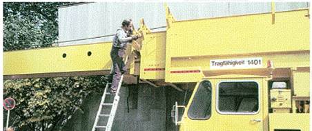Können bei Rüstarbeiten am Kran hoch gelegene Arbeitsplätze nicht über kraneigene Aufstiege und Laufstege gefahrlos erreicht werden, sind vom Kranbetreiber geeignete Leitern oder Tritte bereitzustellen. Es empfiehlt sich daher, auf dem Kran grundsätzlich eine geeignete Leiter mitzuführen (Abb. 47). Sie kann z.B. auch beim Anschlagen von Lasten ein sicheres Besteigen zum Erreichen der Anschlagpunkte gewährleisten.