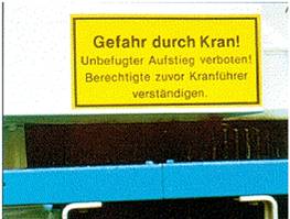 Unbefugte dürfen Krane nicht besteigen. Befugte nur dann, wenn sie sich vorher mit dem Kranführer verständigt haben. An jedem Kranaufstieg muss darum ein Schild angebracht sein, das Unbefugten den Aufstieg untersagt (Abb. 48).