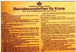 Bedienungsfehler durch den Kranführer können die Sicherheit in Frage stellen. Die Einhaltung von bestimmten Regeln muss daher zur Vorschrift erhoben werden. Diese Forderungen sind in den §§ 29 bis 43 der UVV "Krane" (BGV D6) niedergelegt. Bei kraftbetriebenen Kranen müssen sie in Form eines Aushanges an oder in der Nähe der Steuereinrichtungen so angebracht sein (Abb. 49), dass sie für den Kranführer jederzeit einsehbar sind.