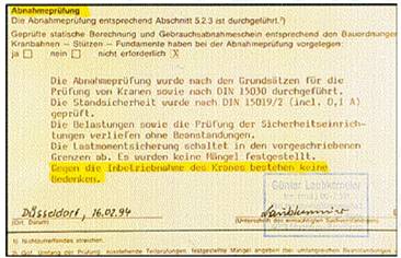 " Gegen die Inbetriebnahme des Kranes bestehen keine Bedenken".