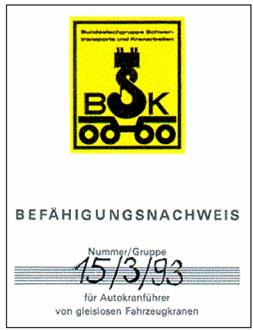 Die Berufsgenossenschaft für Fahrzeughaltungen hat der Entwicklung auf dem Gebiet der gleislosen Fahrzeugkrane Rechnung getragen. Sie führt schon seit Jahren - entsprechend ihrer Aufgabe, mit allen geeigneten Mitteln für eine wirksame Unfallverhütung zu sorgen - Spezial-Unfallverhütungslehrgänge für Kranführer aus Autokranunternehmen durch. Daneben richtet die Bundesfachgruppe Schwertransporte und Kranarbeiten (BSK) im Bundesverband des Deutschen Güterfernverkehrs e.V. (BDF) Lehrgänge für Führer von gleislosen Fahrzeugkranen aus (Abb. 99). Die erfolgreiche Teilnahme an einem derartigen Lehrgang wird dem Teilnehmer durch die Aushändigung des " BSK-Befähigungsnachweis für Autokranführer von gleislosen Fahrzeugkranen" bestätigt.