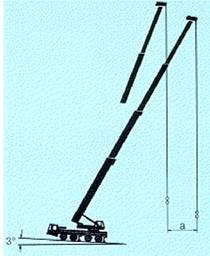 Bedingung für die Durchführung der Kranarbeit ist der waagerecht aufgestellte Kran. Im allgemeinen erlaubt der Kranhersteller eine max. Schrägstellung von 0,5 % zur Waagerechten. Abweichende Werte sind der Bedienungsanleitung zu entnehmen. Steht der Kran nicht waagerecht und wird die Last "bergseitig" angehoben und zum Gefälle hin geschwenkt, hat dies eine unerwünschte Vergrößerung der Ausladung zur Folge. Außerdem bleibt die Last nicht im Lot stehen, sondern bewegt sich durch die ihr innewohnende Dynamik über das Lot hinaus noch weiter vom Kran weg. Dadurch kann der Kran umstürzen oder tragende Teile des Kranes - meist der Ausleger - "abgedreht" werden. Dazu ein Beispiel (siehe Abb. 121):