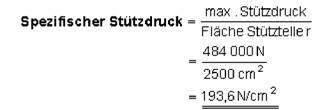 Ein 50 t-Autokran mit Teleskopausleger hat einen max. Stützdruck von 484000 N. Seine quadratischen Stützteller, Seitenlänge 50 cm, haben je Stützteller eine Fläche von 2500 cm2. Wie groß ist der höchste spezifische Stützdruck dieses Kranes je Stützteller?