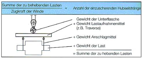 Für die Errechnung der Anzahl der einzuscherenden Seilstränge ist nicht nur das Gewicht der zu hebenden Last, sondern auch das Gewicht von Unterflasche oder Hakengeschirr sowie das Gewicht von Lastaufnahmemitteln und Anschlagmitteln zu berücksichtigen (Abb. 135).