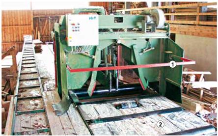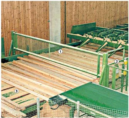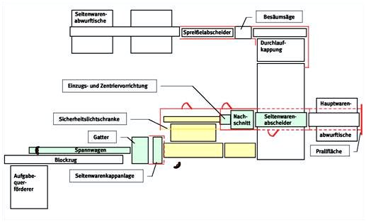 | Anordnung von Stellteilen | Vorne oder seitlich am Maschinengehäuse in festgelegten Bereichen oder auf einem beweglichen Schaltpult auf der Beschickungsseite | Am Bedienplatz, gefahrlos zu betätigen | Die damalige Fassung der VBG 7j enthielt keine speziellen Regelungen für Mehrblattsägen, es bestand jedoch ab 1980 Nachrüstpflicht | |