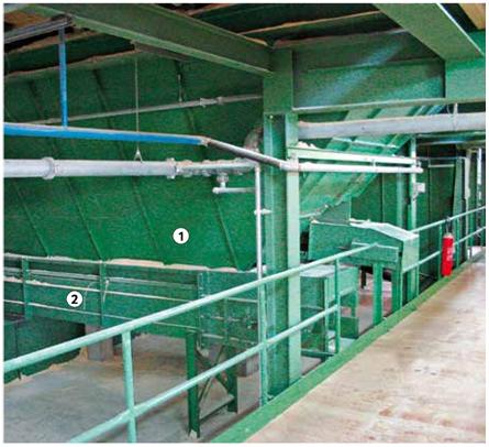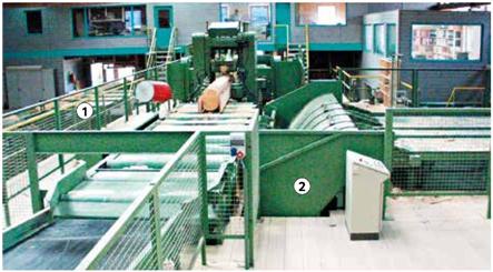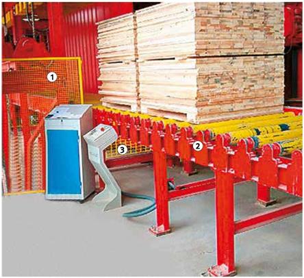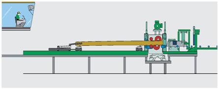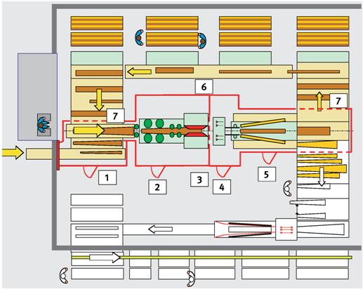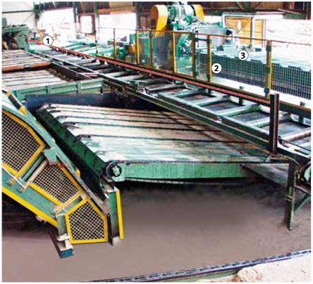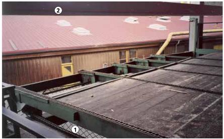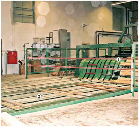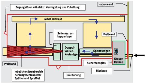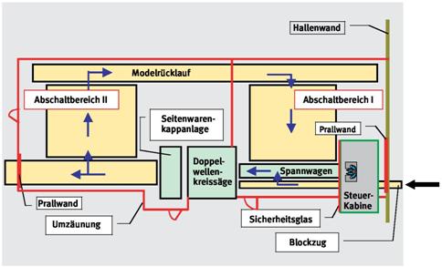 Sicherheitsabstand von mindestens 0,5 m zwischen Gatterspannwagen und festen Teilen der Umgebung (z.B. rückseitige Hallenwand); ausgenommen hiervon ist der Abstand zwischen Gatterspannwagen und Querübergabeförderer, der aus technologischen Gründen wesentlich kleiner ist.