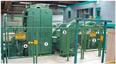 | Verriegelung mit Zuhaltung; der Zugriff zu den Einzugsstellen muss gesichert sein durch einen Mindestabstand von 550 mm oder durch Schutzeinrichtung mit Annäherungsreaktion | Vorschubwalzen müssen bis auf den für den Transport benötigten Teil verkleidet sein | Keine zusätzlichen Anforderungen | ||